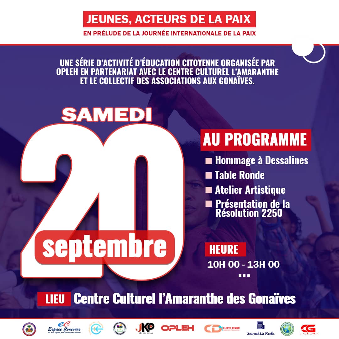 Ce samedi 20 septembre, au Centre Culturel l’Amaranthe des Gonaïves, élèves, étudiants, jeunes leaders et artistes se rassemblent pour une grande journée d’éducation citoyenne autour de la paix.